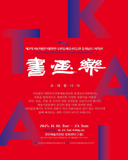 제2회 사단법인 대한민국전통예술전승원 충청남도지회전✅ 일시 : 2025.11.18.(화) ~ 2025.11.23.(일) 10:00 ~ 18:00✅ 장소 : 천안예…